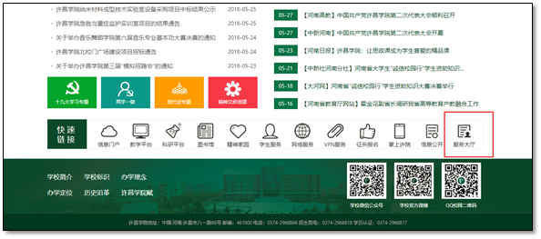 访问学校首页(http://www.xcu.edu.cn/),右下角点击“服务大厅”(图1),即可进入网上服务大厅登录页面,也可以在浏览器地址栏直接输入http://ehall.xcu.edu.cn(推荐使用谷歌浏览器或360极速浏览器)。