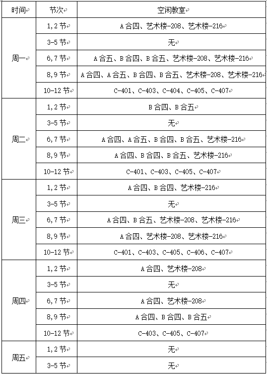 1.上述表格按课表结构统计空闲教室,只能在该时间段内去相关教室自习,自习时间严格遵守学校统一的作息时间。如遇学校重大活动,自习教室服从学校统一调度。