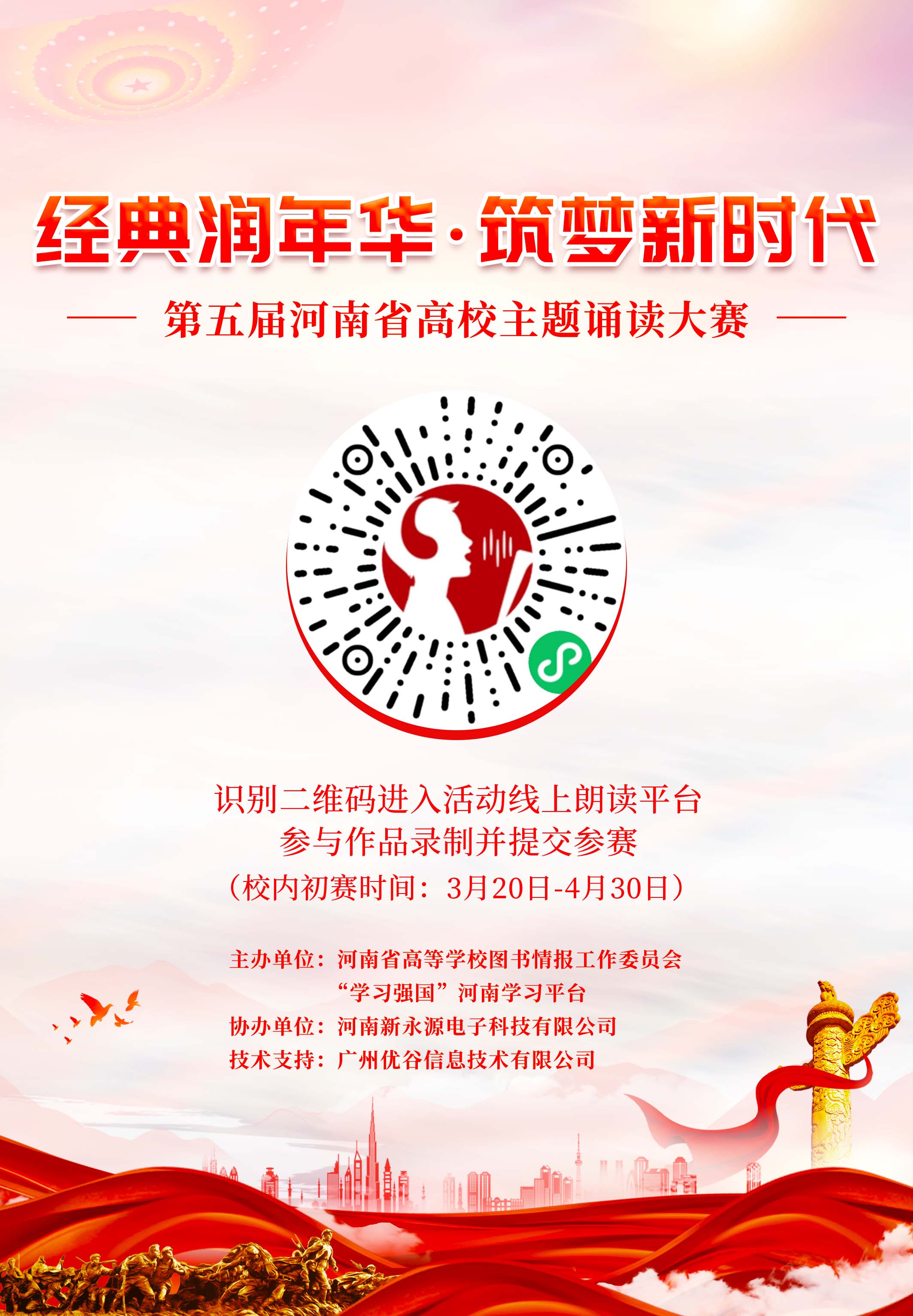 为深入贯彻落实习近平新时代中国特色社会主义思想,践行党的二十大精神,庆祝新中国成立75周年,纪念红军长征胜利90周年,在第29个“世界读书日”(4月23日)来临之际,河南省高等学校图书情报工作委员会将举办第五届河南省高校“经典润年华·筑梦新时代”主题诵读大赛,现将有关事项通知如下: