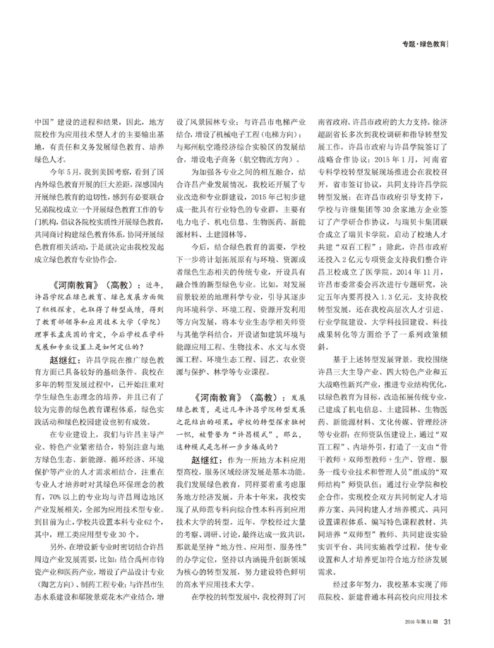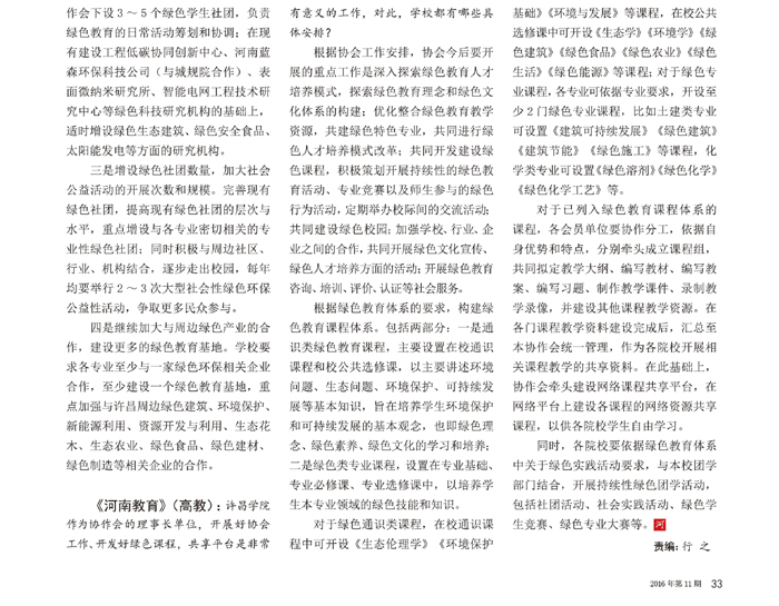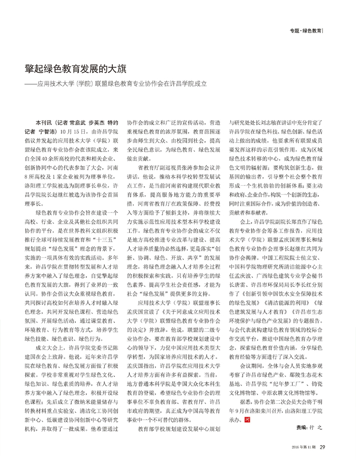 编者按:《河南教育》(高教)2016年第11期以《擎起绿色教育发展的大旗》为题专题报道bet36体育在线绿色教育工作成效。其认为bet36体育在线自升本以来,在转型发展和人才培养过程中主动融入绿色理念,自觉擎起绿色教育发展大旗,并倡导成立应用技术大学(学院)联盟绿色教育专业协作会,与国际可持续教育发展紧密接轨,改变了国内高校绿色教育开展几乎空白的现状。