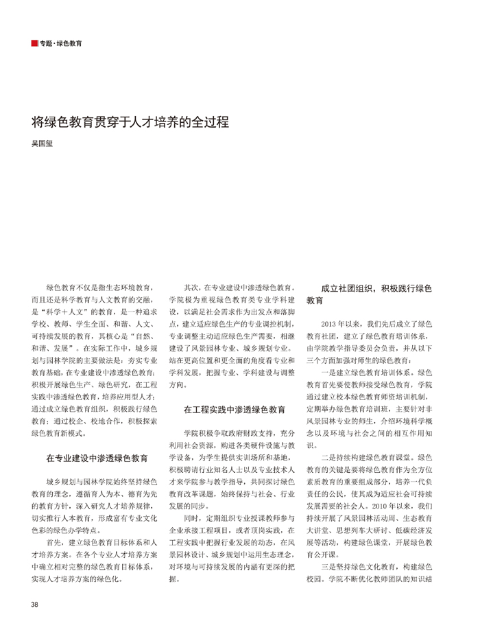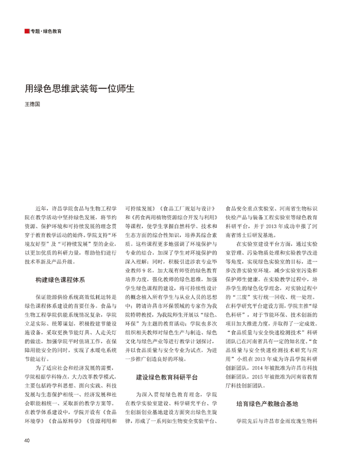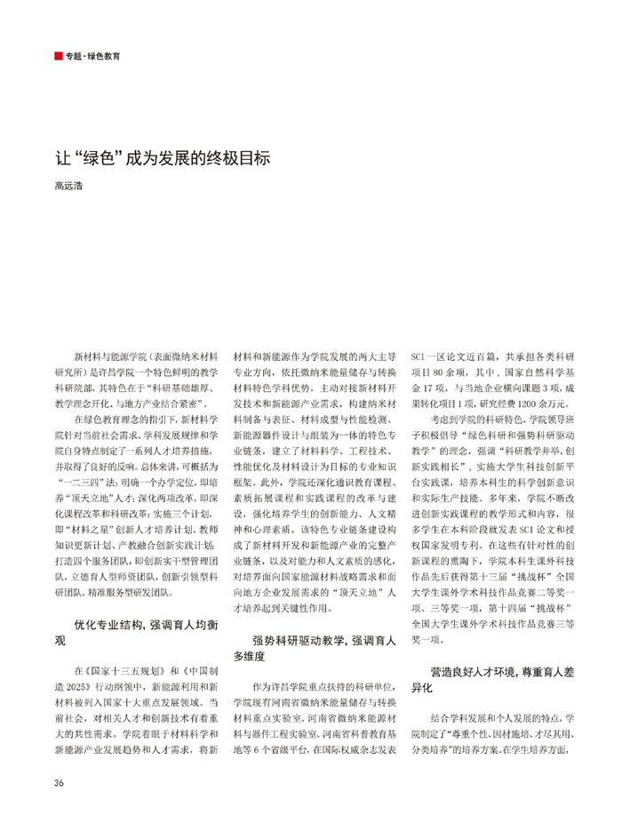 专题覆盖14个页码共计两万余字,内容包括应用技术大学(学院)联盟绿色教育专业协作会全景式综述、让绿色教育走进每个师生的内心——赵继红院长专访,还分别对bet36体育在线电气(机电)工程学院、新材料能源学院、城乡规划与园林学院、食品与生物工程学院的绿色教育特色工作进行了报道。