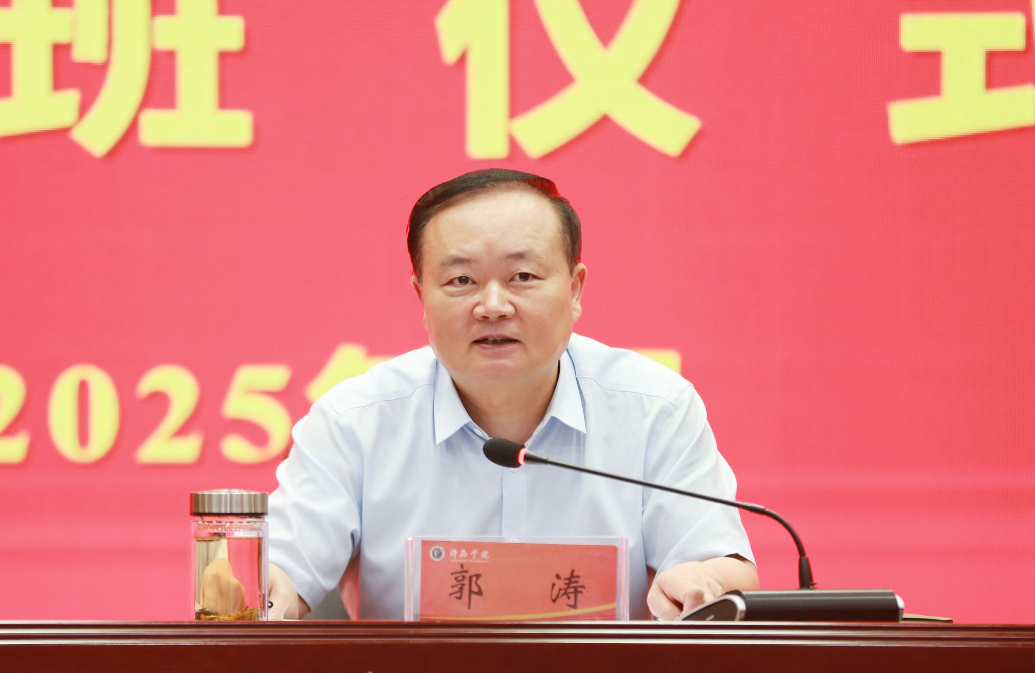 郭涛在会上讲话。他指出,这次培训是在学校深入贯彻落实习近平总书记考察河南时的重要讲话精神和学校第三次党代会精神、开启“十五五”规划谋篇布局之际,在全校上下奋力冲刺硕士学位授予单位、加快推进高水平应用型大学建设的关键时期,举办的一次十分重要的培训。培训班主题鲜明、内容丰富、形式多样、针对性强,达到了预期效果。他强调,全体中层干部要以此次培训为新的起点,努力把学习成果转化为推动工作的行动自觉,转化为攻坚克难、锐意进取的强大动力,奋力开创学校事业高质量发展的新局面。一要认清发展形势,坚定不移推进学校向理工转型发展。要深刻认识向理工转型发展的时代必然性和现实紧迫性,进一步统一思想、坚定信心、保持定力、团结奋斗,不断彰显学校理工办学特色。二要坚持以申硕为牵引,奋力推动学校办学层次实现新提升。要抓规划强引领,抓育人强素质,抓学科强内涵,抓人才强支撑,抓创新强成果,抓改革强治理,汇聚学校高质量发展的强大力量。三要强化使命担当,进一步激发攻坚克难、争创一流的精气神儿。全体干部要做到讲政治、把方向,抓学习、强本领,强担当、重实干,重团结、聚合力,守廉洁、树形象,积极营造良好的政治生态。