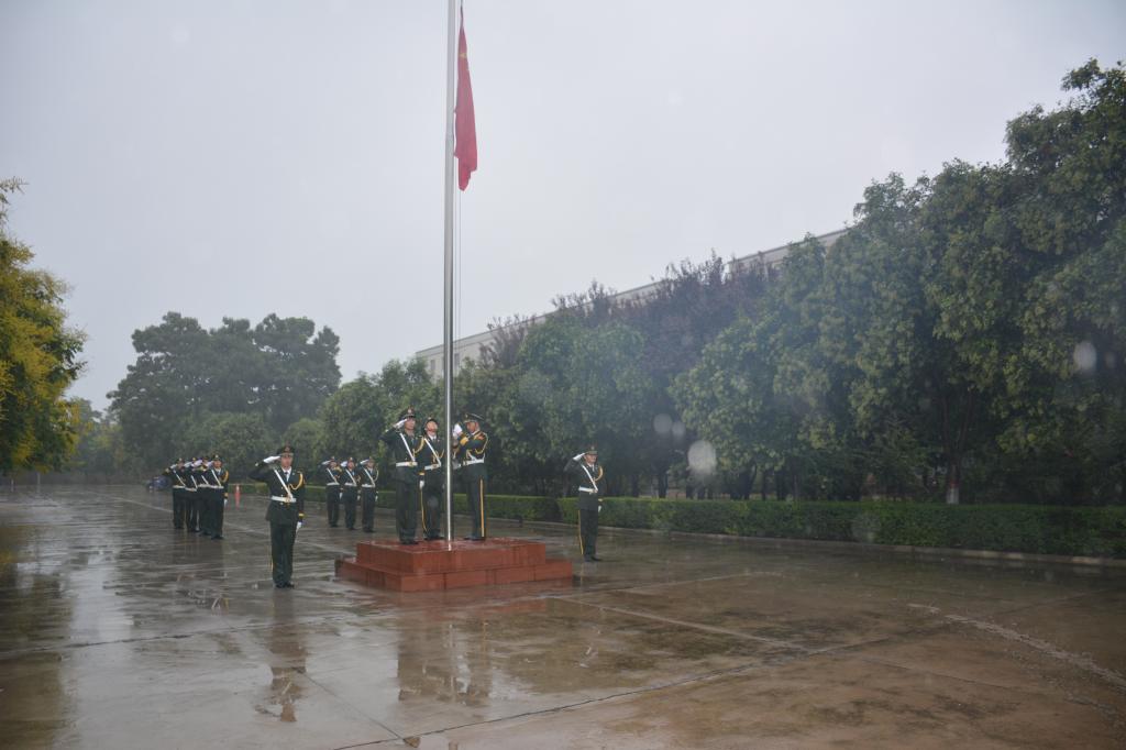 清晨的天空飘着小雨,但抵挡不了许院人热情的步伐。6时许,来自各学院的学生代表自发有序的到指定地点列队完毕。6时30分,国旗护卫队队员护送者鲜艳的五星红旗,迈着矫健的步伐走上国旗台,伴随着雄壮的国歌,五星红旗沐浴着初秋的晨风,冉冉升起,现场师生怀着崇敬与自豪的心情面向国旗行注目礼。朝气蓬勃的学子、气势磅礴的图书馆在鲜艳的五星红旗下,焕发出别样的风采。
