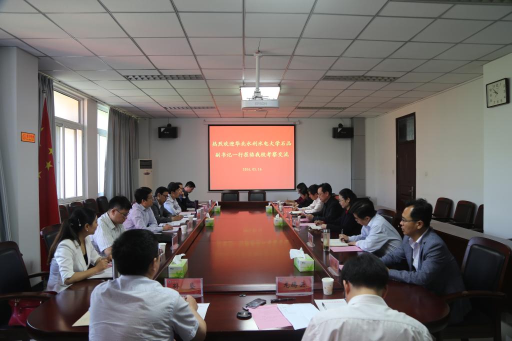 5月16日,华北水利水电大学党委副书记石品带领考察团一行9人来bet36体育在线考察交流。院长赵继红、党委副书记马超会见了来访客人,并与客人开展了座谈交流。党委办公室主任潘春彩、党委组织部部长谭水木、党委宣传部部长冯晓民等也参加了交流活动。
