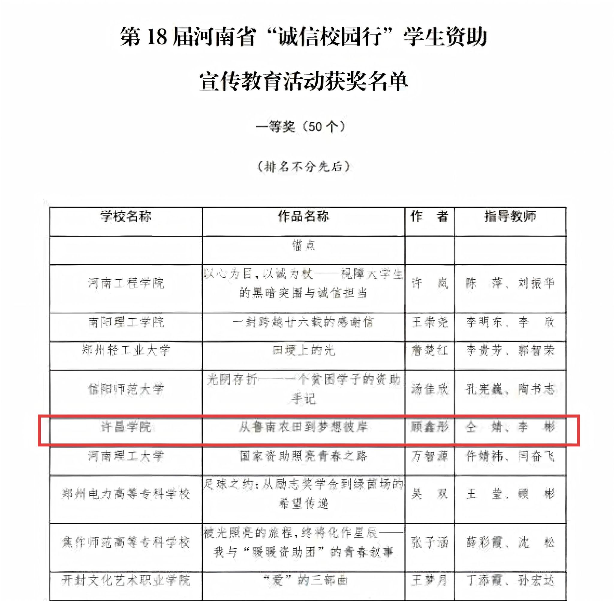 近日,第18届河南省“诚信校园行”学生资助宣传教育活动结果评选结果揭晓,bet36体育在线选送作品在比赛中获一等奖1项、三等奖1项。