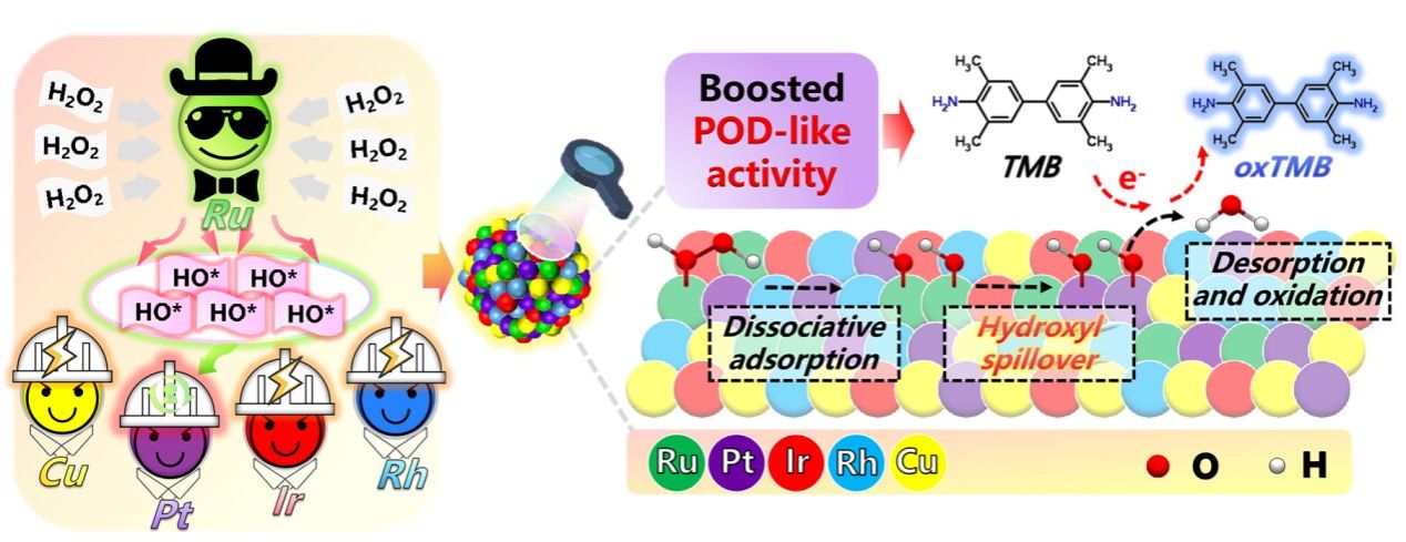 RuPtIrRhCu高熵合金纳米酶“羟基溢流”与POD-like活性增强机制示意图