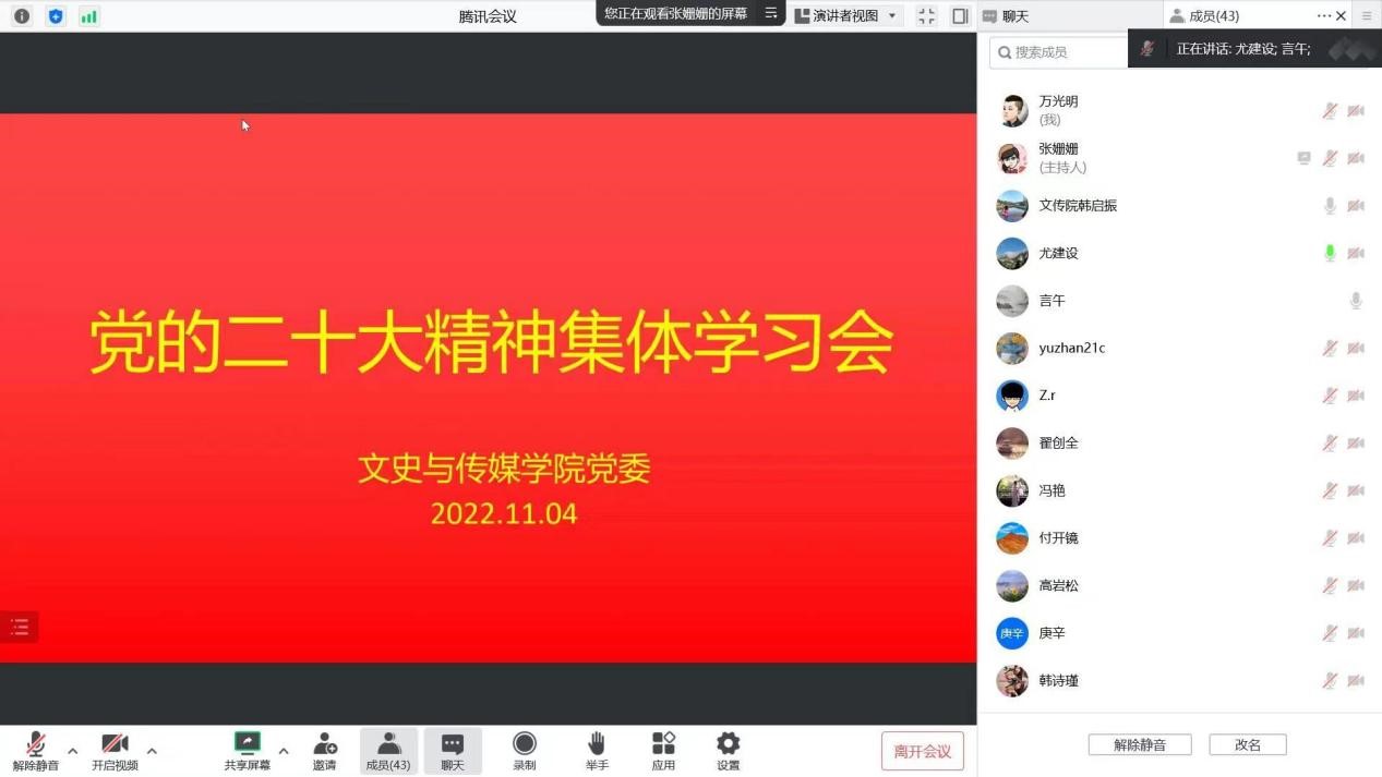 11月4日下午,文史与传媒学院以线上形式召开学习宣传贯彻党的二十大精神集体学习会。会上,文史与传媒学院党委书记许涛围绕“五个牢牢把握”要求,结合个人的学习感受作专题报告。会议指出,要把学习宣传贯彻党的二十大精神作为思想政治教育和课堂教学的重要内容,切实抓好党的二十大精神进教材、进课堂、进头脑工作,确保学习宣传贯彻党的二十大精神在文史与传媒学院落实到位、见质见效。会议要求,要进一步提高政治站位,把立德树人融入思想政治教育、文化知识教育、社会实践教育各环节,不断用党的创新理论凝心铸魂。要持续加强师德师风建设,努力培养德智体美劳全面发展的社会主义建设者和接班人,培养有理想、敢担当、能吃苦、肯奋斗的高素质应用型人才。