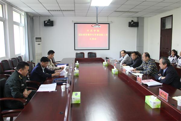 ????? 会上,崔斌副院长代表学校对军事训练调研督查组一行的到来表示热烈欢迎。他从学生军事训练工作组织领导及规章制度建立情况、学校军事教学机构及师资配备情况、落实教学大纲情况、军事理论课开设情况、学生军事训练经费和教学保障情况、安全防范事故情况和开展学校国防教育活动情况、开展在校学生的人民防空教育情况、军训及国防教育工作面临的主要困难等八个方面向调研督查组汇报了bet36体育在线的国防教育和学生军训工作。他说,bet36体育在线党委、校行政高度重视学生的国防教育和军事训练工作,每年都把新生国防教育及军训工作作为必修课来安排,在省教育厅体卫