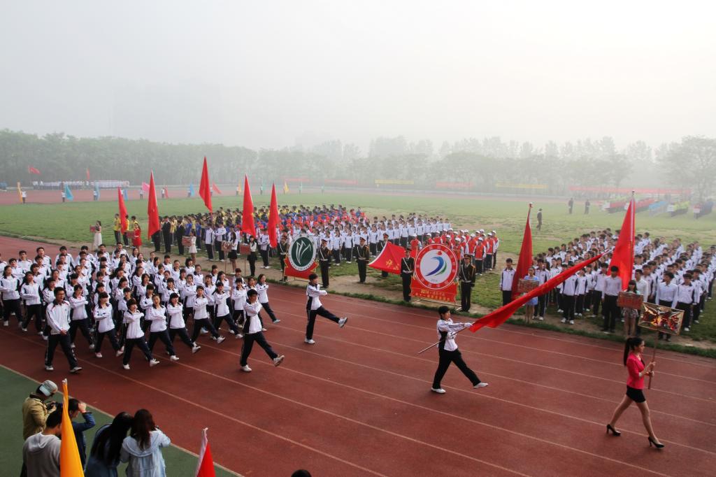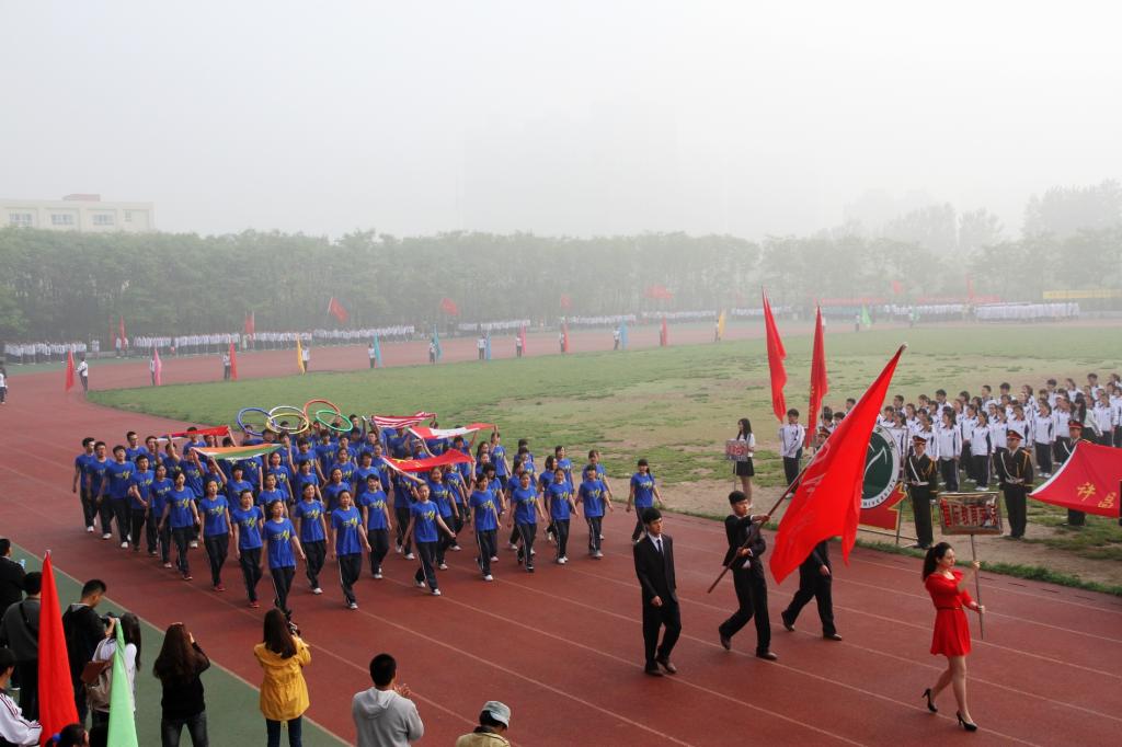 上午8时,伴随着雄壮激越的《运动员进行曲》,全体裁判员、运动员在校旗、运动会会徽和彩旗方队的引导下顺序入场。