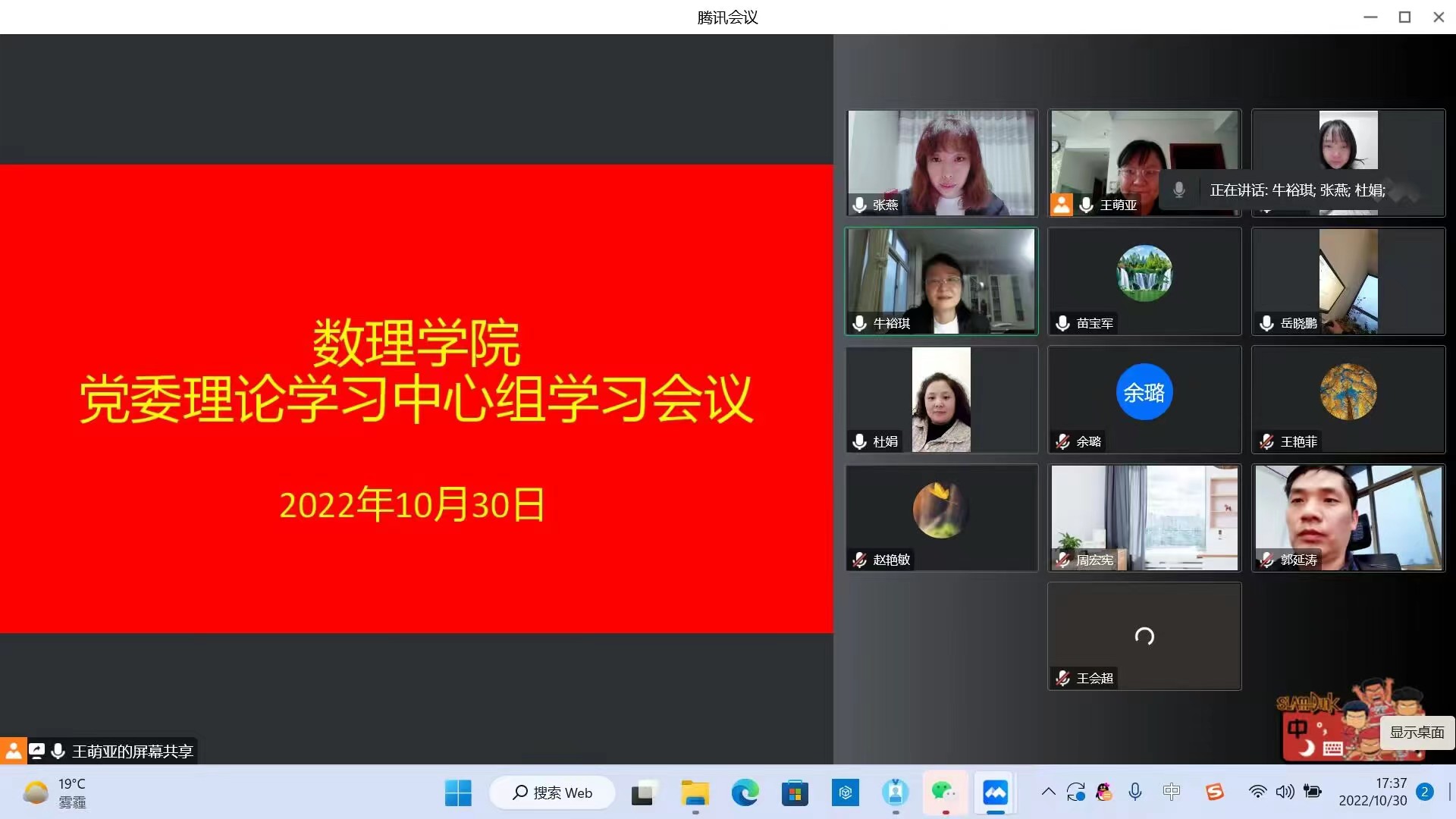 10月30日下午,数理学院党委以线上形式召开党委理论学习中心组学习会议,集中学习宣传贯彻党的二十大精神,全体党委理论学习中心组成员参加会议,全体辅导员列席会议。会上,数理学院党委书记牛裕琪领学了党的二十大报告精神。会议指出,党的二十大报告从新使命新任务、战略目标两步走,再到科教兴国战略、文化自信自强、意识形态、总体国家安全观等方面指明了我们未来5年乃至更长的时间的发展方向。会议强调,作为高校教师党员,要牢记“为党育人,为国育才”时代使命,持续深入学习领会二十大报告精神实质,深刻把握其核心要义,坚守立德树人根本任务,站在服务国家战略的层面,胸怀以创新驱动发展战略为首的科教兴国战略、人才强国战略,努力在提升学生综合素质能力和创新人才培养方面作出数理人应有的贡献。