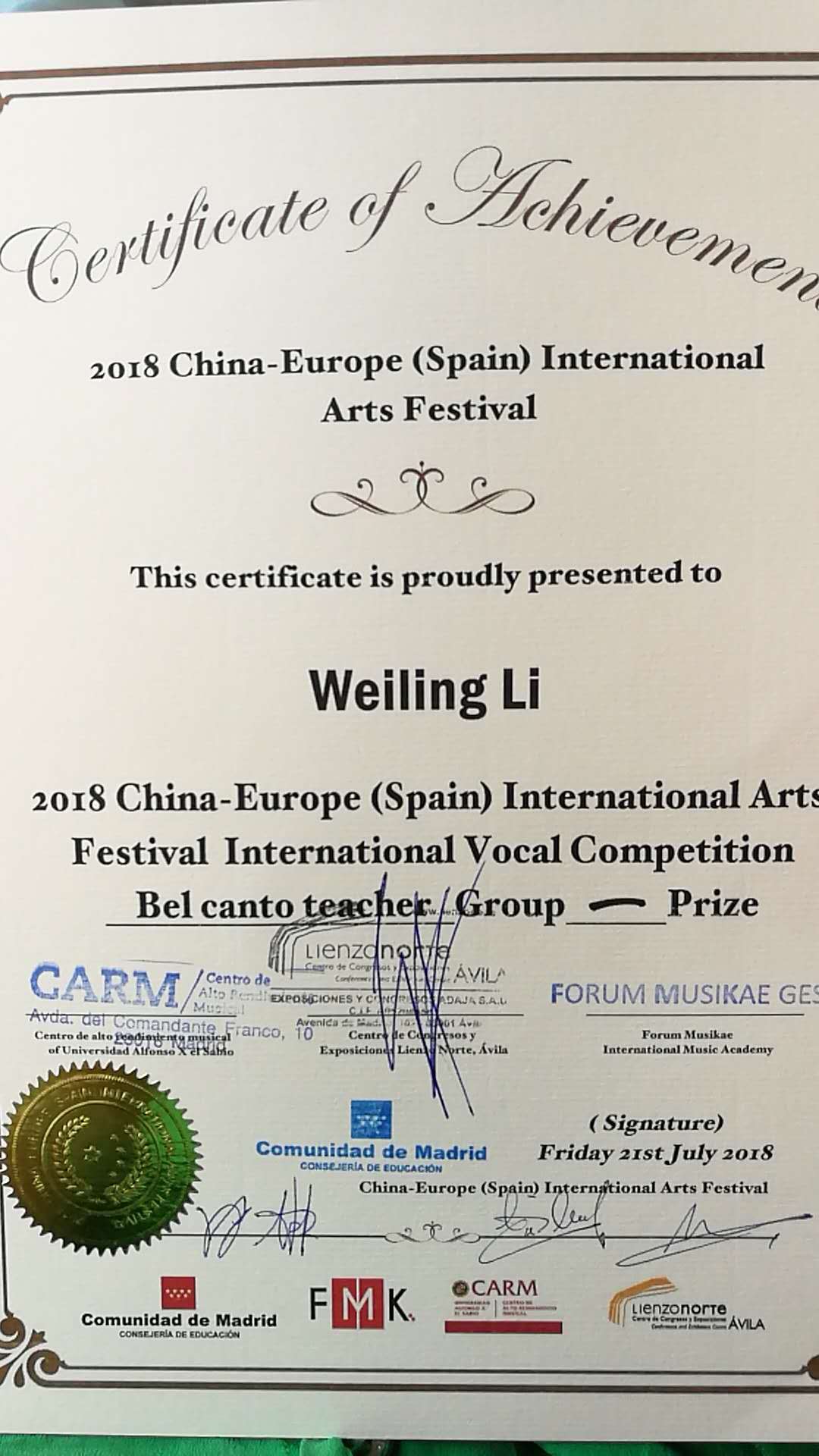 为庆祝中西建交45周年,由西班牙驻华大使馆以及中国驻西班牙大使馆大力支持,西班牙马德里大区政府、西班牙马德里大区文化教育部、西班牙阿维拉北利恩索艺术中心联合主办的2018中欧艺术节国际声乐比赛于7月16日-26日在西班牙首都马德里举行。bet36体育在线青年教师李卫玲荣获该赛事美声教师组第一名。