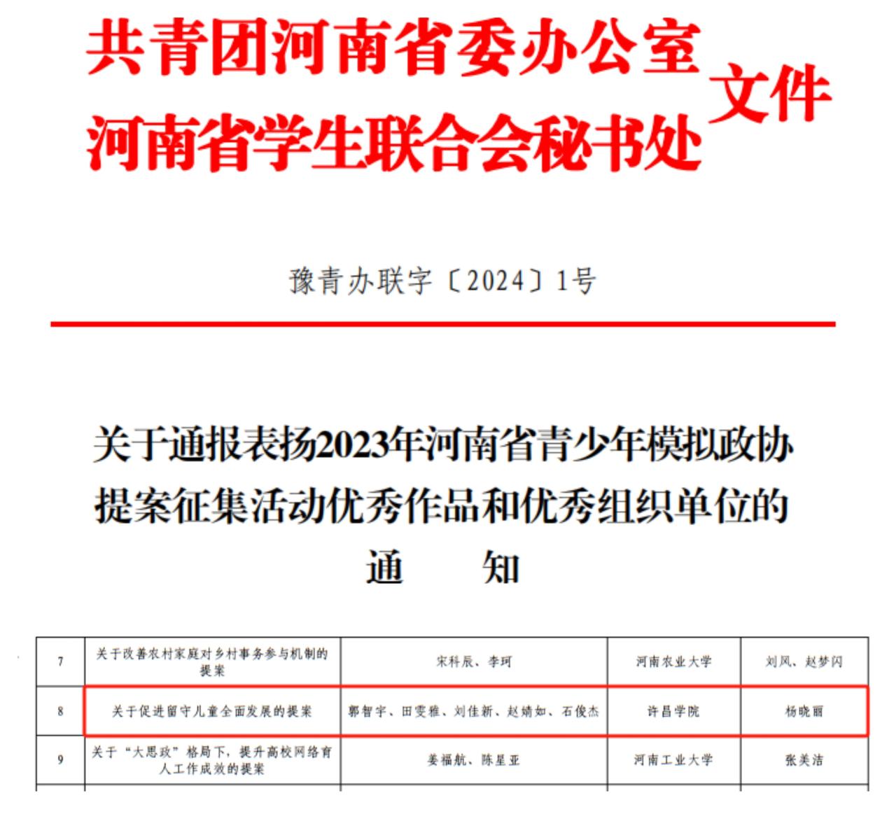 近日,共青团河南省委、河南省学生联合会印发《关于通报表扬2023年河南省青少年模拟政协提案征集活动优秀作品和优秀组织单位的通知》,由bet36体育在线法学院杨晓丽老师指导、2022级法学1班郭智宇等同学撰写的作品《关于促进留守儿童全面发展的提案》获优秀作品,并入围全国评审环节。这是bet36体育在线连续三年荣获河南省青少年模拟政协提案征集活动优秀作品,也是bet36体育在线推荐的作品首次入围全国评审环节。