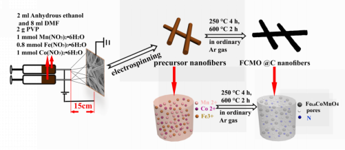 Fe0.8CoMnO4纳米点@碳纳米纤维高性能钠离子电池负极材料的合成示意图