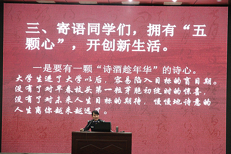 启动仪式结束后,第四季中国诗词大会季军、平顶山市公安局胡艳琴警官为参加本次活动的全体师生代表做了题为“你在读书上花的任何时间,都会在某一个时刻给你回报”的专题讲座。胡艳琴向听众分享了自己学习诗词的心得经验,并寄语同学们要拥有“五颗心”:即有一颗“诗酒趁年华”的诗心,一颗“三更灯火五更鸡,正是男儿读书时”的决心,一颗“读书不觉已春深,一寸光阴一寸金”的上进心,一颗“长风破浪会有时,直挂云帆济沧海”的信心,和一颗“千淘万漉虽辛苦,吹尽狂沙始到金”的恒心。讲座结束后,应现场观众的要求,由胡艳琴和第四季中国诗词大会百人团选手杨皓翔同学作为队长各带领10人,进行了精彩的诗词“飞花令”活动。