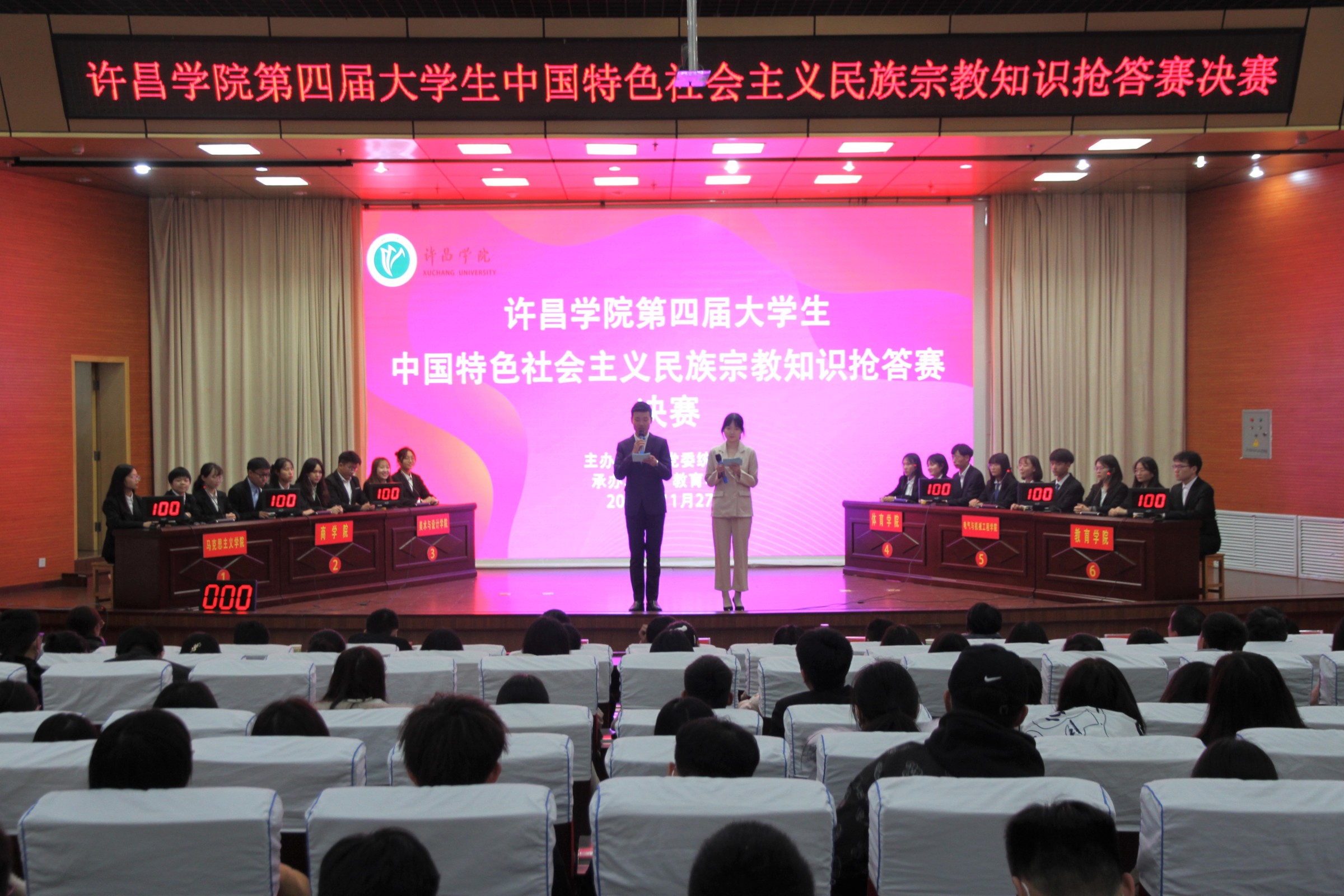 11月27日下午,由党委统战部主办、教育学院承办的bet36体育在线第四届大学生中国特色社会主义民族宗教知识抢答赛决赛在学术报告厅举办。党委副书记孙海出席活动并为获奖单位颁授奖牌。党委宣传部、统战部、学生工作部,校团委及教育学院相关负责人参加活动,近200名师生代表观看了比赛。
