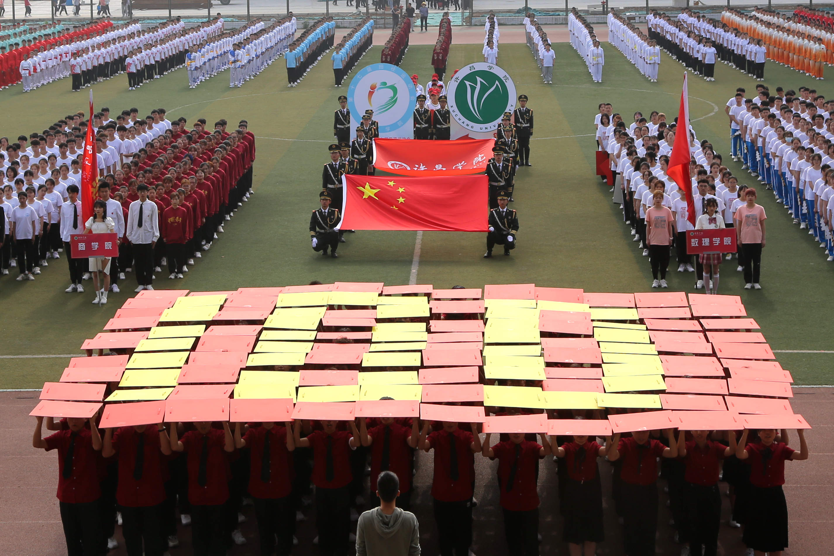 上午8时,伴随着激昂的《运动员进行曲》,国旗队方阵、裁判员方阵和各学院方阵踏着整齐的步伐依次入场。同学们身着别出心裁的院服,朝气蓬勃、尽展风采,赢得全场师生的阵阵喝彩。