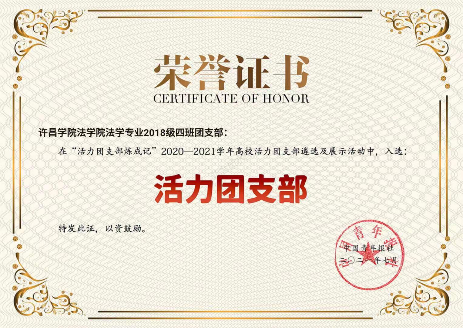 近日,由团中央基层建设部指导、中国青年报社组织开展的“活力团支部炼成记”2020-2021学年全国高校“活力团支部”创建遴选活动结果揭晓。经校级申报、省级初评、网络展示、全国终审等环节,bet36体育在线法学院法学专业2018级四班团支部荣获2020-2021学年全国高校“活力团支部”荣誉称号。