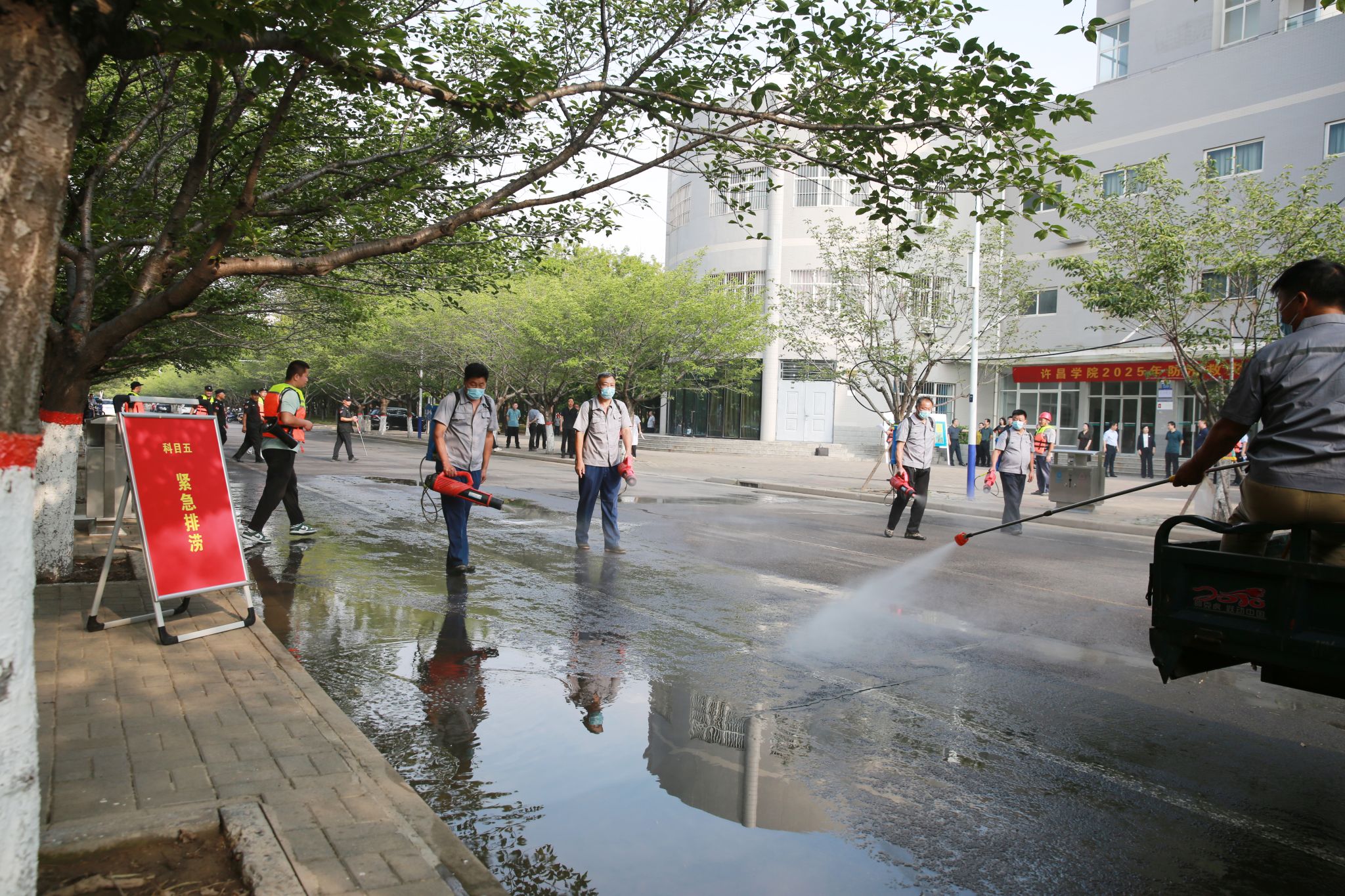 7月9日上午,bet36体育在线组织开展2025年防汛救灾应急演练。校长郑直,副校长冯晓民、赵艳敏到现场观摩指导。党委办公室(维稳工作办公室)、党委组织部、党委宣传部、院长办公室、保卫处、基建管理处、后勤管理服务中心、兴华路校区管理委员会等相关部门负责人及学校防汛应急救援队参加演练。