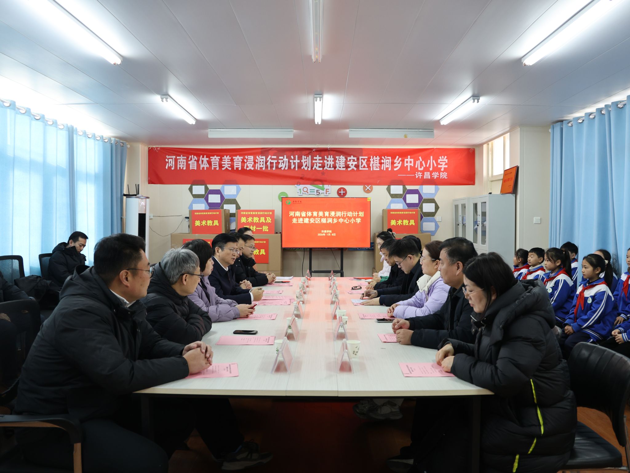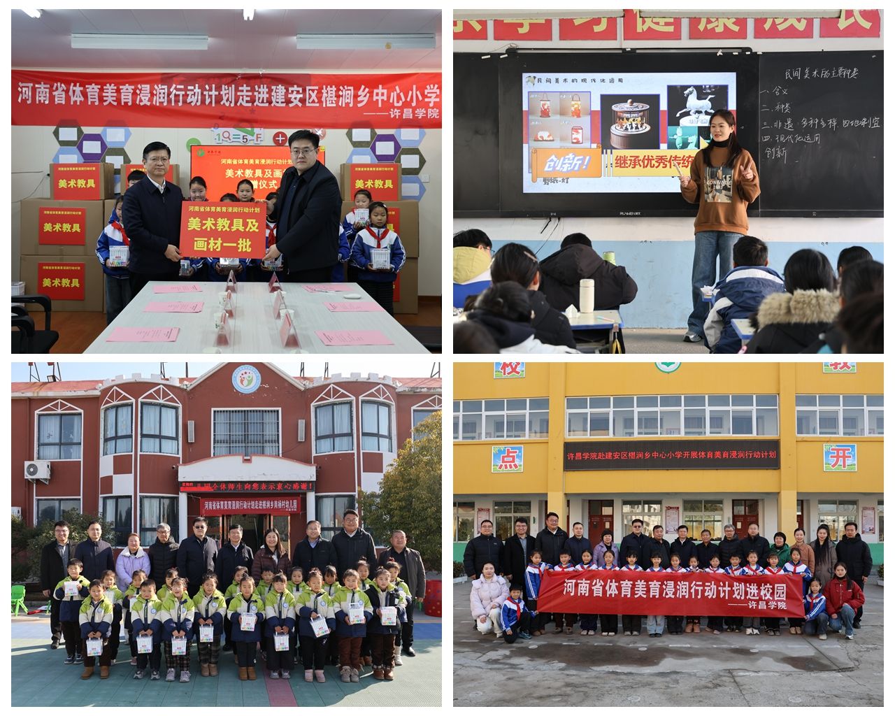 为全面贯彻党的二十届四中全会精神,高质量助力乡村全面振兴,扎实推进河南省体育美育浸润行动计划,1月8日,校党委副书记、工会主席梁予昉带队赴许昌市建安区椹涧乡中心小学和椹涧乡岗杨村幼儿园开展美育浸润行动计划帮扶活动。椹涧乡人大主席牛志明,椹涧乡宣传委员、副乡长王鑫,椹涧乡教育办主任李广恩出席活动。