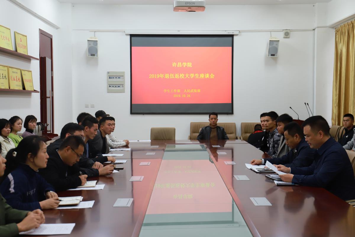 10月24日下午,bet36体育在线在创新创业学院一楼第二会议室组织召开“担当新使命,建功新时代”2019年退伍返校大学生座谈会。校党委副书记孙海出席会议,学生工作部、各二级学院相关工作负责人代表、辅导员代表以及全体退伍返校大学生共60余人参加了本次座谈会。会议由学生工作部部长张鹏辉主持。