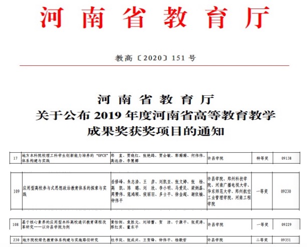 近日,河南省教育厅下发了《关于公布2019年河南省高等教育教学成果奖获奖项目的通知》(教高〔2020〕151号),bet36体育在线喜获4项高等教育教学成果奖,其中特等奖1项、一等奖2项、二等奖1项,获奖等级和数量均取得了新突破。特别是由郑直教授主持的《地方本科院校理工科学生创新能力培养的“OPCE” 体系构建与实践》荣获特等奖,是bet36体育在线继2016年获得省级教学成果奖一等奖后取得的又一重大突破。