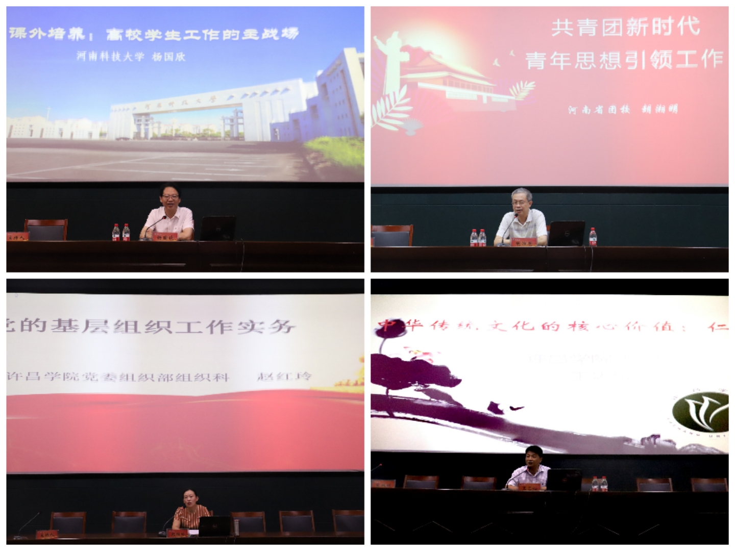 本次培训班根据《高等学校辅导员职业能力标准(暂行)》并结合bet36体育在线团学工作实际,邀请了河南科技大学教授杨国欣、河南团委信息科研中心主任胡湘明、bet36体育在线法学院副院长王忠灿和bet36体育在线党委组织部赵红玲等分别作专题讲座。培训围绕课外培养:高校学生工作的主战线、共青团思想引领工作、坚定文化自信和党的基层组织工作实务等四项内容进行了专题讲座和交流研讨。