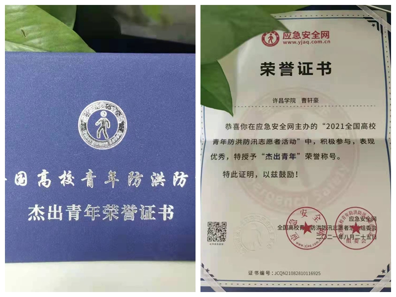 8月25日,应急安全网、全国高校青年防洪防汛志愿者活动组委会寄来荣誉证书,曹轩豪被授予“杰出青年”称号。他说:“几天的志愿工作虽然辛苦劳累,但我觉得意义非凡,这将是我宝贵的人生财富。”