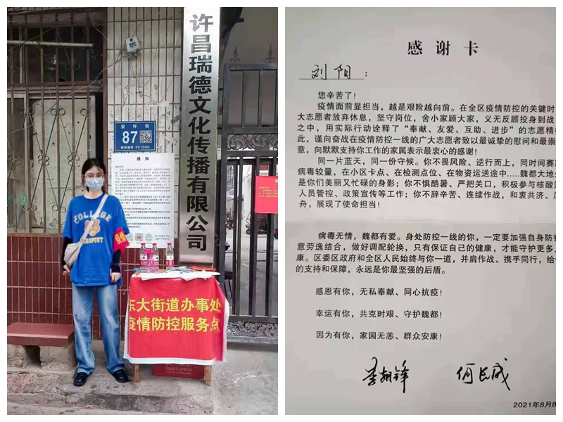 马克思主义学院2021级新生曹佳媚参与了家乡禹州市无梁镇的防疫卡点执勤工作。她说:“志愿服务期间,我感受到了一线工作人员的辛苦,也看到了国家打赢这场疫情防控阻击战的坚强决心。”因表现优秀,曹佳媚被中共无梁镇委员会授予“优秀志愿者”称号。