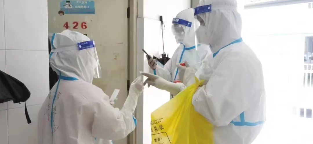 每天早晨6:00,穿着防护服、拿着采集管的“大白”志愿者2人一组,准时出现在各个宿舍门口,配合医护人员做好样本采集工作。
