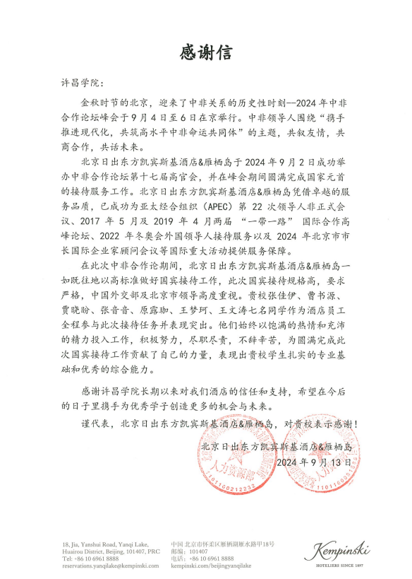 近日,中非合作论坛峰会接待单位北京日出东方凯宾斯基酒店&雁栖岛向bet36体育在线发来感谢信,表彰bet36体育在线商学院旅游管理专业7名实习生在中非合作论坛接待期间做出的贡献。