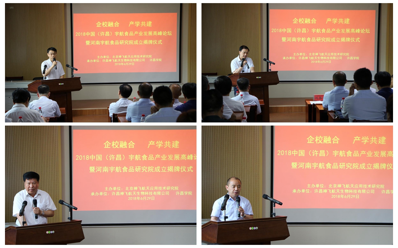 中国航天员科研训练中心航天营养食品室原主任,研究员、北京神飞航天应用技术研究院副院长白树民代表中国宇航食品专家讲话。他表示,许昌食品与工程食品学院硬件设施非常好,北京神飞航天应用技术研究院有海、陆、空、天食品领域的专家团队,两者结合,如虎添翼,相信经过双方的共同努力与合作,河南宇航食品研究院将取得更多成果。