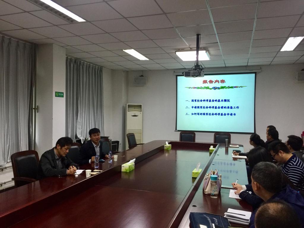 李贵成教授近年来主持国家社科基金项目2项,其中重点项目一项,对国家社科基金项目的申报具有丰富的经验。报告会上,李教授结合自身经验,从国家社会科学基金的基本情况、申请国家社会科学基金前的准备工作和如何写好国家社会科学基金申请书三个方面作了详细的报告。李教授以自己的国家社科基金重点项目申请书为范本,着重从文献收集、研究内容设计、研究方法选择等方面,详细分析了国家社科基金项目申报的基本要求和申请书填写技巧。李教授特别强调申请国家社科基金项目应坚持“边做边报,边学边报,边报边想”的原则,引起了老师们的共鸣。随后,李贵成教授与参会教师围绕项目申报中的具体事宜和有关技巧,进一步展开了深入的讨论和交流。(图片由科技处提供)