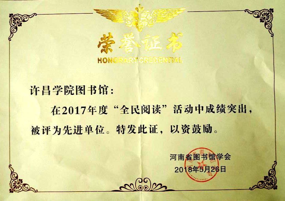近日,从河南省图书馆学会理事会上传来喜讯,bet36体育在线图书馆被河南省图书馆学会授予“2017年度全民阅读先进单位”荣誉称号,这已是bet36体育在线图书馆第九次获得此项荣誉。