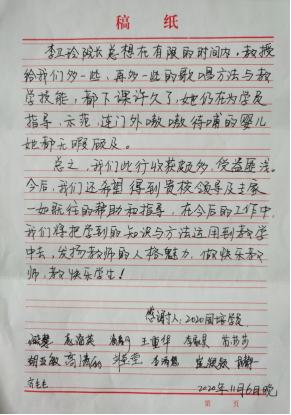 感谢信来自2020年“国培计划”音乐班的学员。学员们在信中对学校领导的关爱、课程安排、培训方式、授课团队、管理服务给予高度评价,表达了对音乐舞蹈学院副院长李卫玲忘我工作、关爱学员的感激之情。