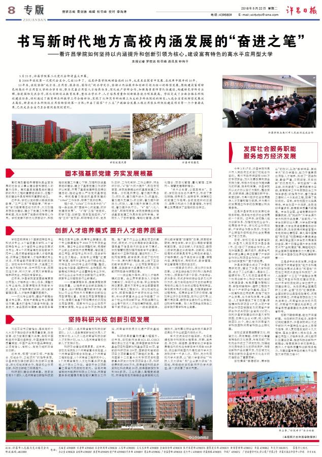 5月22日,《许昌日报》第八版以《书写新时代地方高校内涵发展的“奋进之笔”——看bet36体育在线如何坚持以内涵提升和创新引领为核心,建设富有特色的高水平应用型大学》为题整版报道bet36体育在线近年来办学成效,文章从党建、人才培养、科研、产教融合等方面全面展示了第一次党代会至今的10年来bet36体育在线以内涵提升和创新引领为核心的转型发展之路,以及建设富有特色的高水平应用型大学的创新实践。
