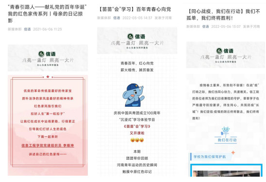 微信公众号探索育人新途径。学院紧跟新时代高等教育要求,在网络意识形态和思政育人方面打造“信语”微信公众号,相继开设“青春引路人”“青春心向党”“齐心抗疫”等系列专栏,围绕“坚定信念、爱党爱国、责任担当、强国有我”四个主题,以师生党员为主体,开展线上读书、讲述红色故事、征集原创作品、撰写抗疫笔记等主题活动50余次,将社会主义核心价值观融入一个个鲜活的案例中,在大学生心灵深处埋下了真善美的种子。