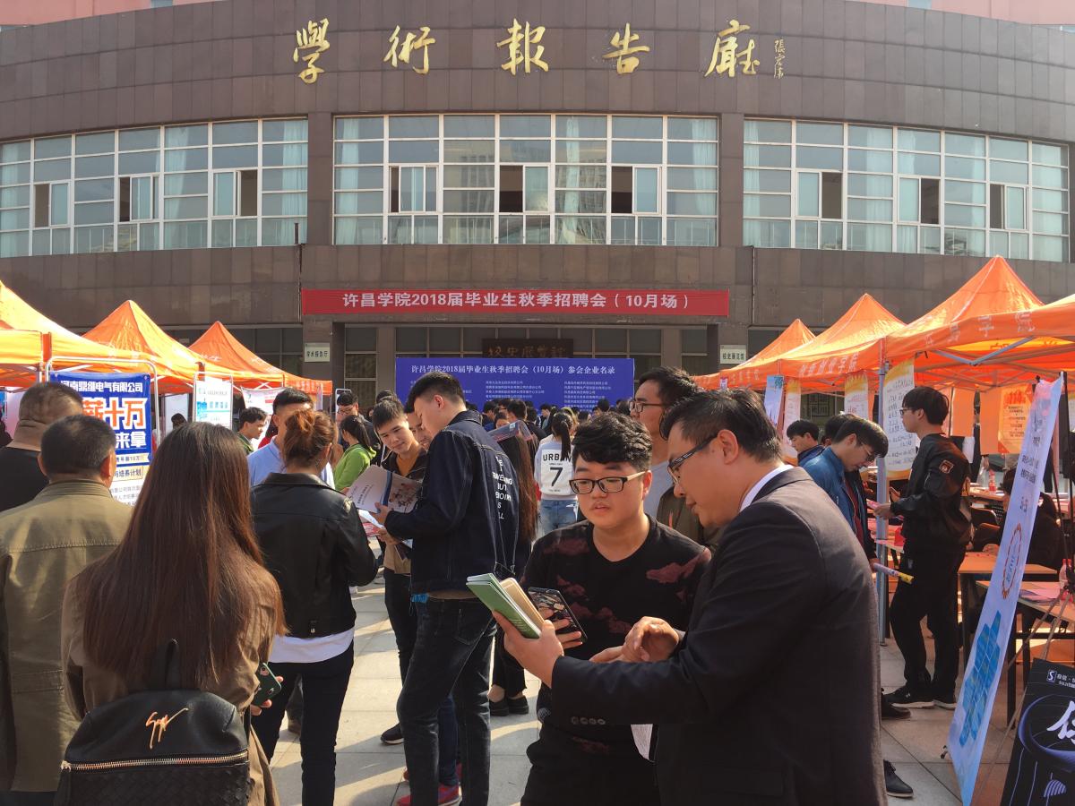 11月17日,由许昌市人力资源和社会保障局与bet36体育在线联合举办的许昌市2018届高校毕业生冬季双向选择洽谈会在bet36体育在线学术报告厅前广场举行。本次冬季洽谈会共吸引河南黄河旋风股份有限公司、众品集团、河南瑞贝卡集团等200家企业到现场进行人才招聘,岗位需求涵盖本科及高职高专学历层次的各个专业,4000多名毕业生进场求职。