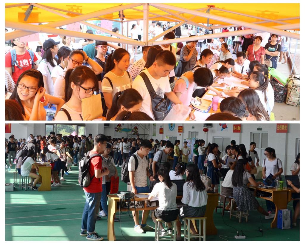 从7号开始,在火车站,高铁站和两个校区报到现场,各院部的领导、老师、志愿者及各部门工作人员就提前开始值班,随时准备接待新生和家长。