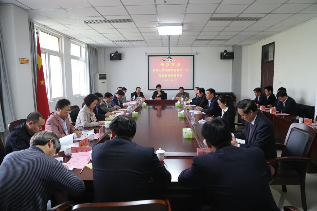 4月22日,湖南人文科技学院党委书记郭军,副校长蒋建初、石潇纯、周发明,工会主席邓和秋等带领学院相关部门负责同志近30人来bet36体育在线参观考察,校领导王清义、马超、黄怡俐、郭涛、杜志傲等接待了考察团一行。党办、人事处、教务处、财务处、科研处、招生就业处、校地合作办公室、后勤集团等部门负责同志和相关院部负责人与来访客人进行了对口交流。王清义书记主持交流座谈活动。