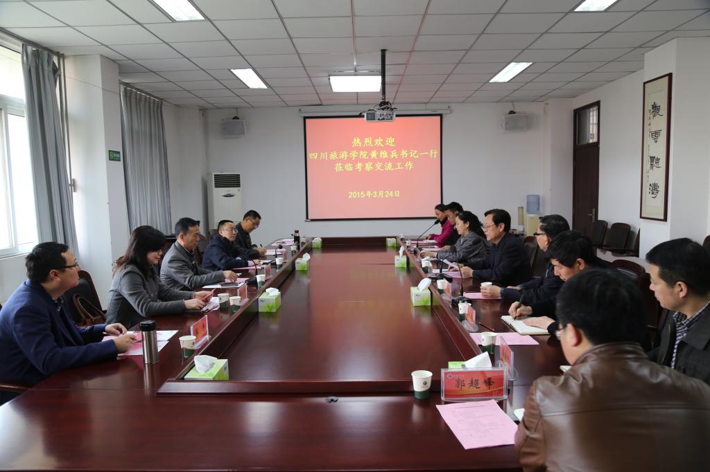 3月24日,四川旅游学院党委书记黄维兵、副院长毛洪涛等6人来校参观考察。校领导马超、张建军、黄怡俐等接待了考察团一行。院办、组织部、教务处、人事处、校地合作办公室等部门负责同志与来访客人进行了对口交流。