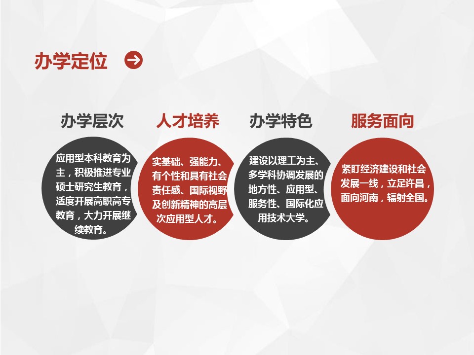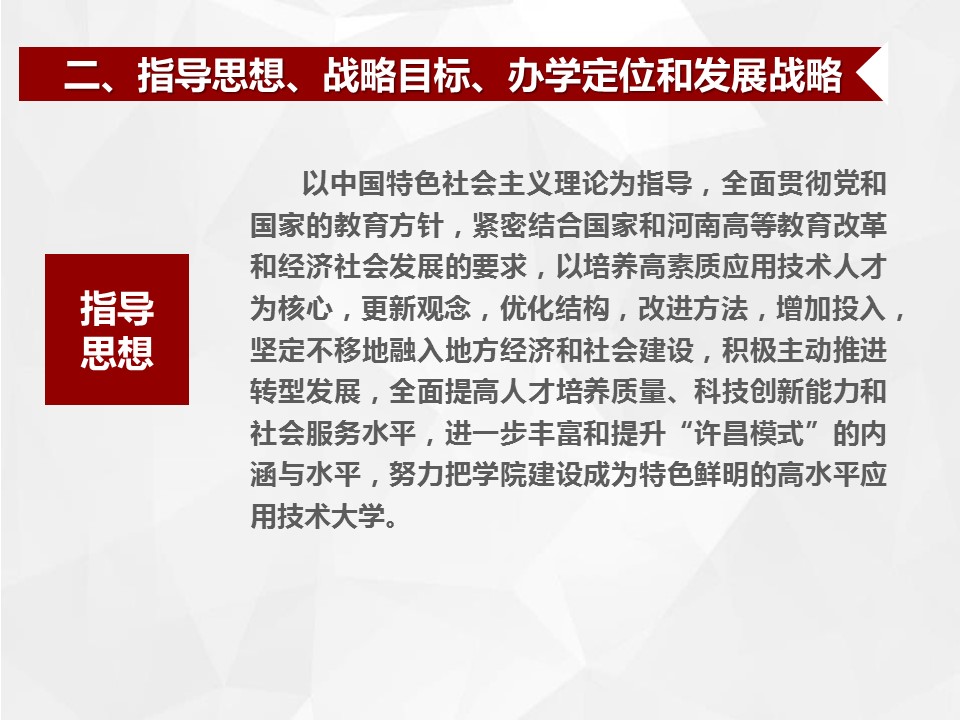总规划明确提出今后五年的发展战略是“坚持四个统一、完善四项基本建设、实现四个突破、形成四大特色”,基本完成“三基一体”的建设任务,即五年内把学校建设成为高层次应用型人才培养基地、政产学研协同创新基地、先进技术转移与服务基地和高等教育、职业教育、继续教育有机联合体。实现发展战略的载体是“河南省示范性应用技术类型本科院校”建设和国家级“十三五”“产教融合发展工程应用型本科院校”建设。五年内事业发展的战略目标是初步建成以培养高层次应用型人才为核心,与区域重点产业、主导产业、特色产业和区域文化高度融合,特色鲜明的高水平应用技术大学。