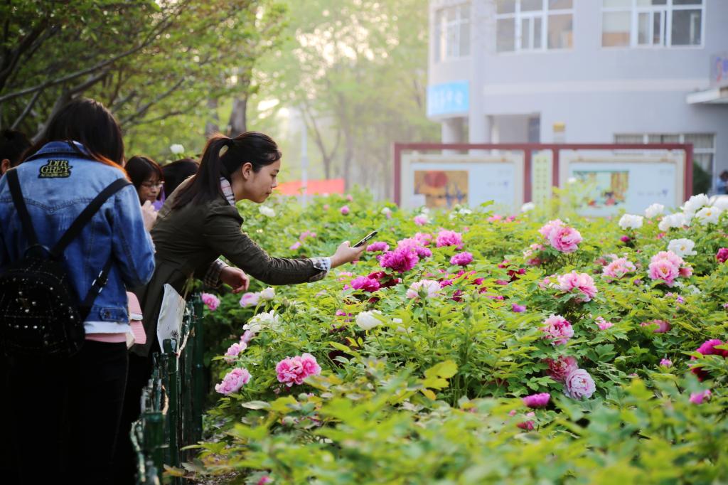 四月初至,bet36体育在线种植在东、西启智楼前的千余株牡丹进入盛花期,竞相逞美,花香四溢,吸引了大批师生和校外游客驻足观赏。