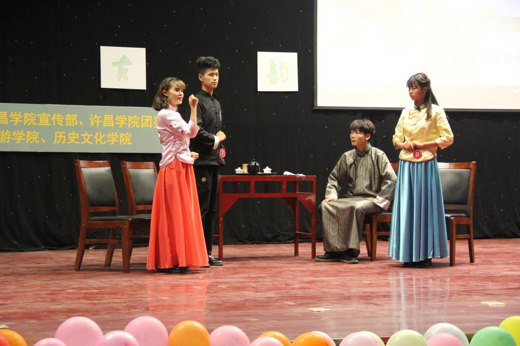 本次大赛以“礼风古韵”为主题,分为“选手亮相”、“礼仪情景剧”和“团队才艺”三个环节。选手分四组共11人,分别展示了唐代、汉代、民国以及现代等不同时代的礼仪。在情景剧展示环节中,选手们排演的情景剧巧妙地将不同时代的礼仪与舞台表演融合在一起,既风趣幽默,又让大家感受到了礼仪的魅力。在团队才艺展示环节,选手们充分发挥团队合作精神,唯美动人的歌舞《千古》、感情饱满的诗朗诵《祖国啊我亲爱的祖国》、青春靓丽的歌伴舞《告白气球》以及酷炫的《古装T台秀》赢得了领导、评委和师生的阵阵掌声。