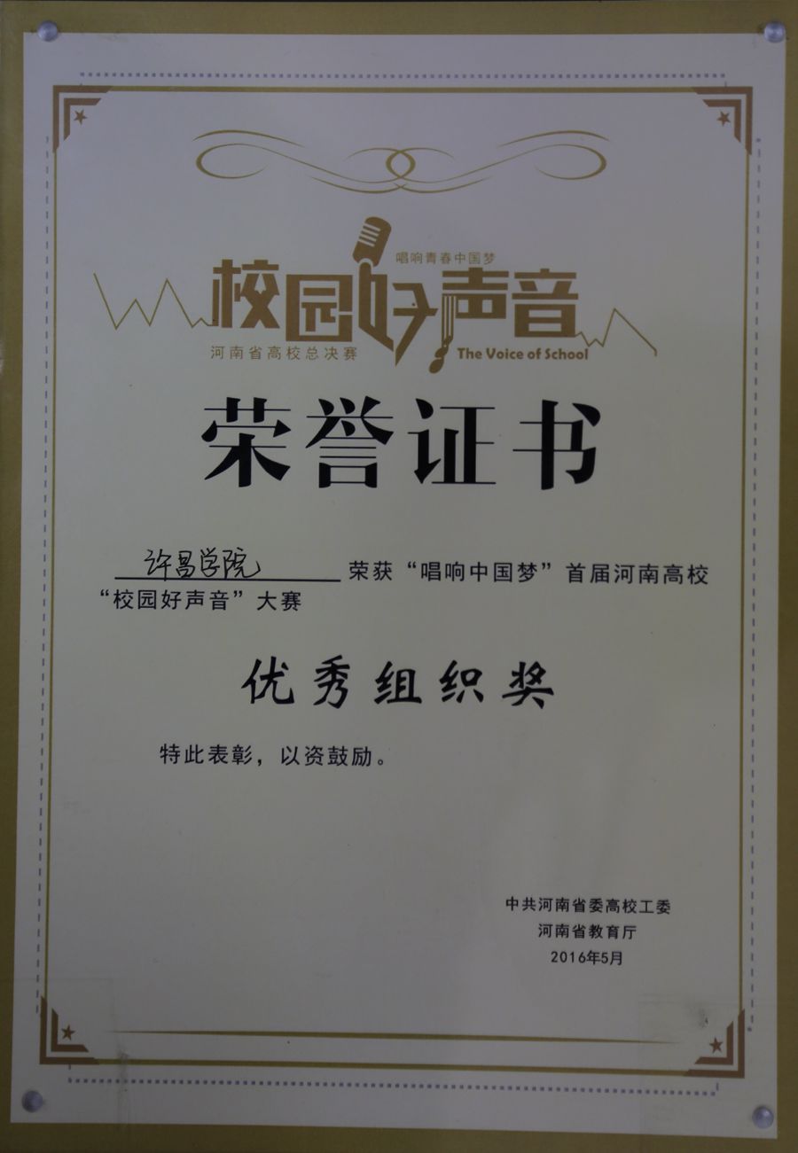 6月1日,中共河南省委高校工委办公室、河南省教育厅办公室下发《关于公布第二届全国高校“校园好声音”大赛河南省高校决赛的获奖结果的通知》(教办思政〔2016〕323号),bet36体育在线荣获优秀组织奖,bet36体育在线音乐舞蹈学院张锋锋老师获得优秀指导教师奖。