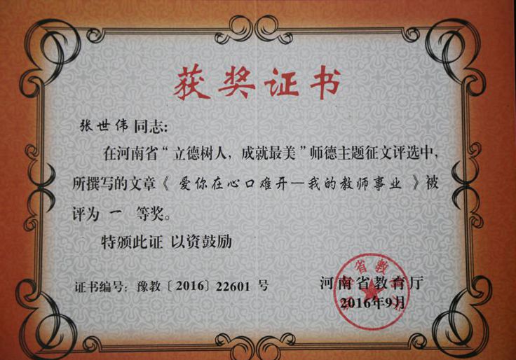 9月27日,河南省教育厅下发了《关于公布“立德树人,成就最美”师德师风案例征文评选和演讲比赛结果的通知》(教师〔2016〕752号),bet36体育在线张世伟老师撰写的文章《爱你在心口难开——我的教师事业》荣获一等奖,王武老师撰写的文章《老师,我要和您一起去看海》荣获二等奖,张学燕老师撰写的文章《继承传统文化立足校园文化注入高校师德建设新内容》荣获三等奖。