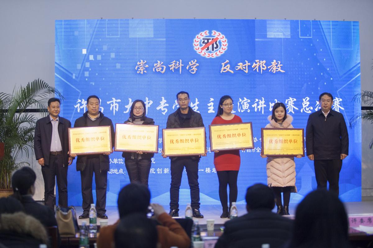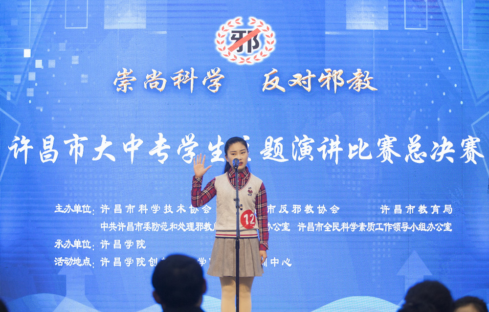 12月15日,许昌市大中专学生“崇尚科学 反对邪教”主题演讲比赛决赛在bet36体育在线创新创业大楼教师培训中心举行。本次决赛由许昌市科学技术协会、许昌市反邪教协会、中共许昌市委防范和处理邪教问题领导小组办公室、许昌市全民科学素质工作领导小组办公室、许昌市教育局主办,bet36体育在线承办。河南省反邪教协会秘书处秘书长杜莉,许昌市人大常委会副主任、市科协主席、市反邪教协会理事长周为民,许昌市委政法委副书记周晓斌,bet36体育在线党委副书记孙海,许昌职业技术学院副院长郭长庚等出席活动。市委防范办、市反邪教协会各理事单位分管领导,各县(市、区)科协、反邪教协会负责人以及全市师生代表共计350余人观摩了本场比赛。