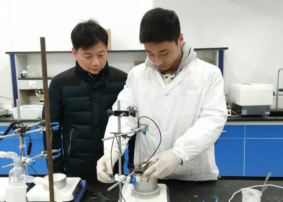 我们了解到,魏宇辉当前一段时间主要跟随化学化工学院的韩培林老师做半导体纳米材料的系列研究,其主要研究方向为纳米半导体材料——单质铋的制备及性能测试。“规律而充实”是魏宇辉对寒假留校做实验的总结。每天早上八点起床,八点半到实验室做实验 、学习,中午吃饭一小时,之后继续做实验,晚上9:50回寝室。寝室,食堂,实验室,三点一线的生活虽显单调但却十分充实。
