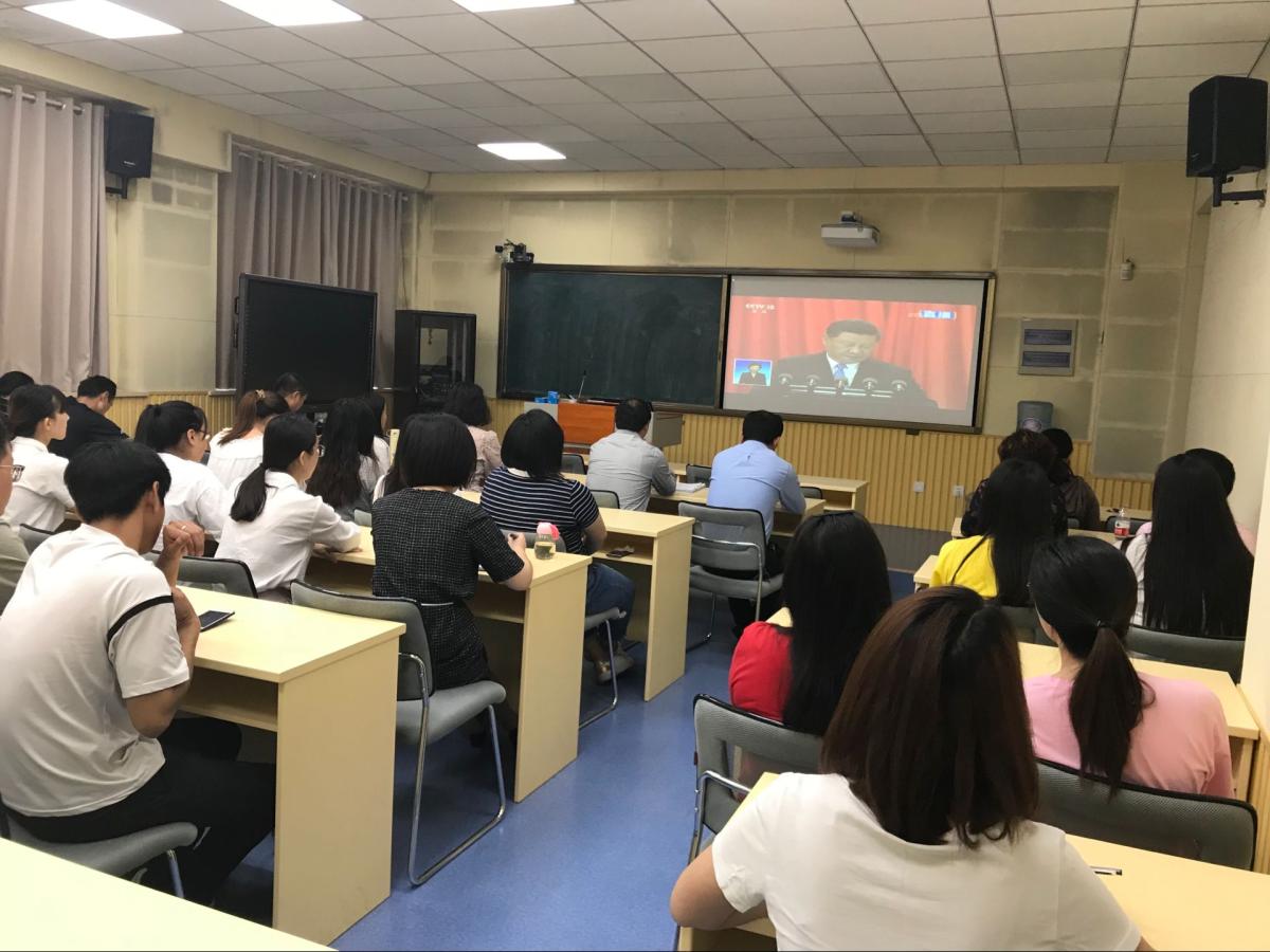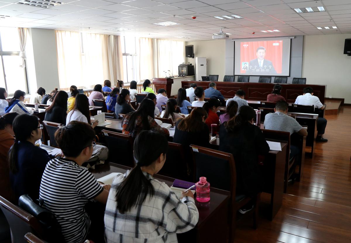 党委书记闫纪建,副书记马超、孙海,纪委书记罗凤英,副院长赵正风、崔斌,工会主席高金星和党群机关党总支、行政机关党总支的全体党员在办公楼第三会议室一同收看了大会实况,全校31个基层党委(党总支、直属党支部)认真组织师生集中收看大会的直播。