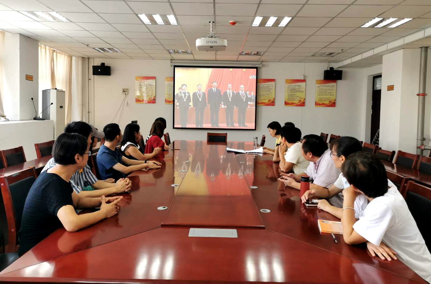 校级领导闫纪建、岳修峰、孙海、郭涛、黄怡俐、周新峰、高金星、潘春彩和机关党委党员干部在办公楼第三会议室集中收看了实况直播。各单位各部门师生员工分别利用网络、广播、电视、新闻客户端等多种形式认真收听收看大会,聆听习近平总书记发表的重要讲话。