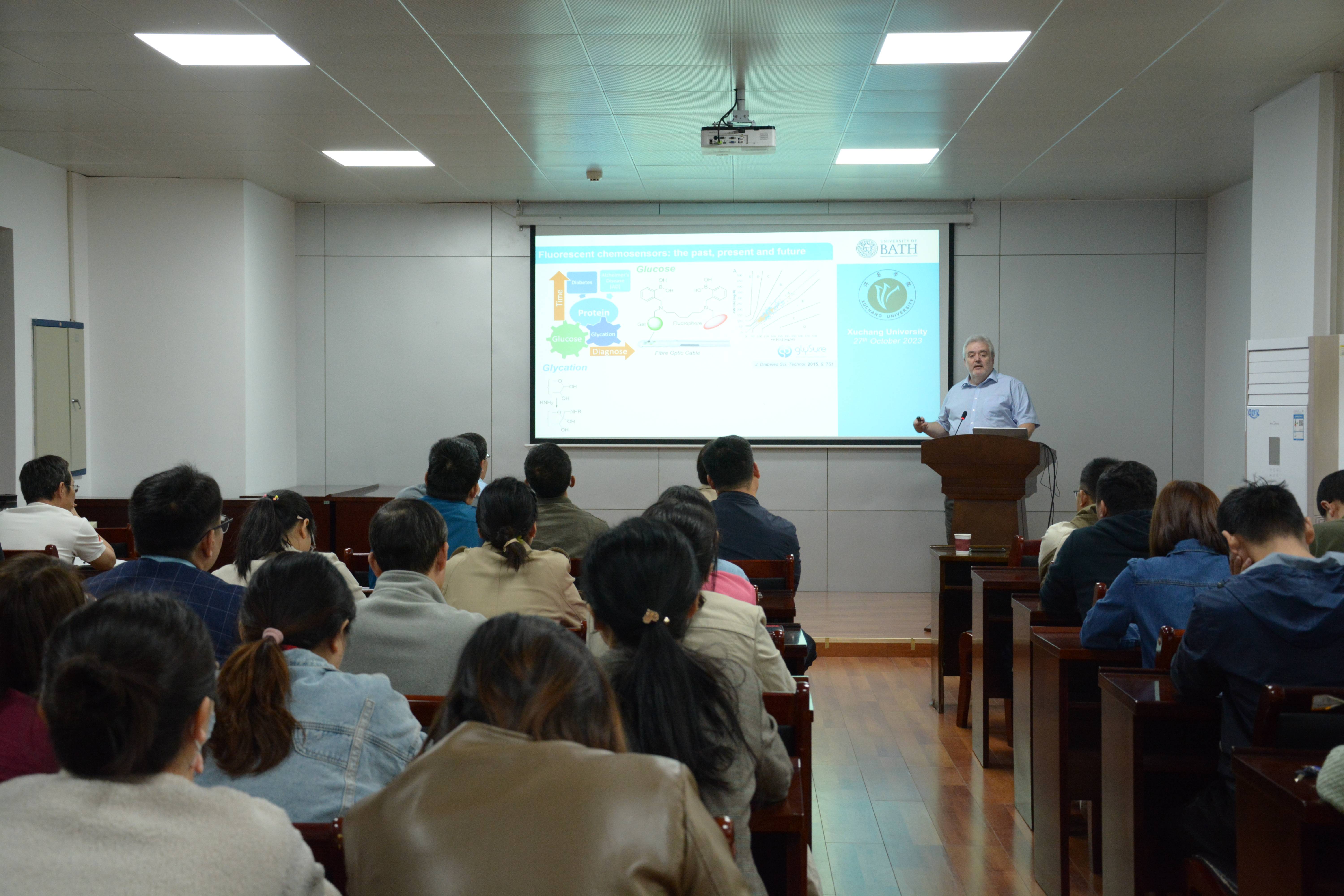 10月27日,应bet36体育在线邀请,英国皇家化学会会士、英国巴斯大学化学系教授、博士生导师Tony D. James来校交流,并为bet36体育在线师生作题为“Fluorescent chemosensors: the past, present and future”的学术报告。校长郑直教授出席报告会。化工与材料学院部分师生聆听了报告,报告会由化工与材料学院党委书记许志红主持。